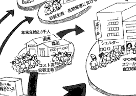 だから、私たちも<第2ステージ>にエネルギーをそそいでいます。しかし、シェルターには質・量ともに限界があり、やはりこの案は有効だと考えます。「素泊まりではだめだ。(仕事の連結とか)さまざまなものが足りない」(行政)というのなら、簡宿組合提案を土台に、かつ何が足りないのかを同じテーブルで考えればいいことです。